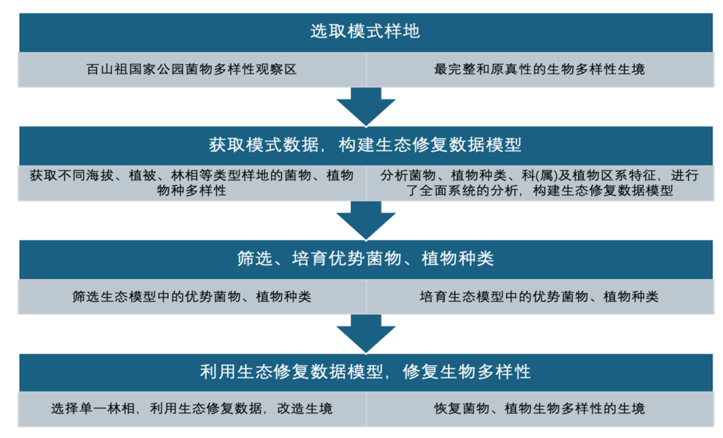 以模式样地采集、收集到的数据,以及生态修复样地前后采集、收集到的为基础,构建菌物生态修复模型。在示范基地进行推广试验,并结合大数据、人工智能模型,打造服务式模型,输入待修复样地基本数据,模型通过计算给出初步修复方案,并根据实际需求开展定制化生态修复方案。